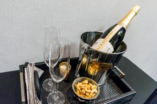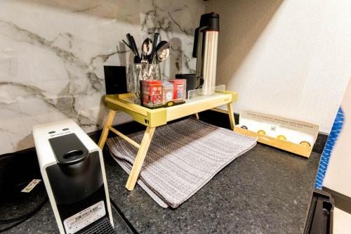 تتوفر (1) غرفة نوم في هذه الشقة، وغرفة معيشة، ومطبخ مجهز بالكامل فيه ثلاجة وماكينة قهوة، و (1) حمّام مع دش ومجفف للشعر، وجهاز تكييف. تتوفر مناشف وبياضات أسرّة في الشقة.