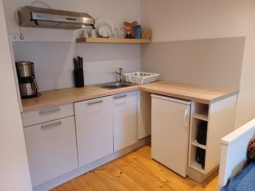 المطبخ مجهز بثلاجة وغسالة صحون وموقد مسطح، بالإضافة إلى ماكينة قهوة وغلاية.