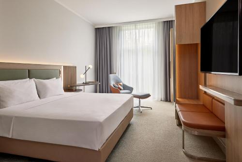 Look forward to spacious, bright rooms at the Courtyard by Marriott Magdeburg hotel, all featuring a flat-screen TV, minibar, white wicker armchairs and red carpets.