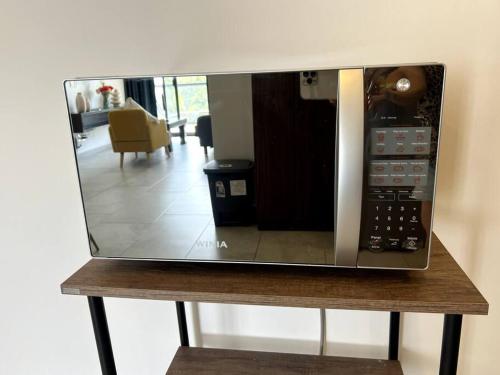 تتوفر (1) غرفة نوم في هذه الشقة، وتلفزيون بشاشة مسطحة، ومنطقة لتناول الطعام، ومطبخ فيه ثلاجة، وغرفة معيشة، وجهاز تكييف.