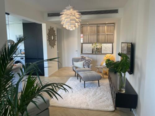 تتوفر (1) غرفة نوم في هذه الشقة، وغرفة معيشة، ومطبخ مجهز بالكامل فيه ثلاجة وماكينة قهوة، و (1) حمّام مع دش ولوازم استحمام مجاناً، وجهاز تكييف. يتوفر تلفزيون بشاشة مسطحة.
