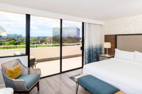 Guest rooms at the Renaissance Newport Beach Hotel feature elegant décor with wood furniture. A 42-inch flat-screen TV and a coffee maker are included. The marble bathrooms include bathrobes.