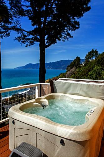 يقدّم مكان إقامة "Gorgeous Oceanview, by OceanviewHotTubs Oceanfront! Shelter Cove, CA Tesla EV Station" حوض استحمام ساخن.