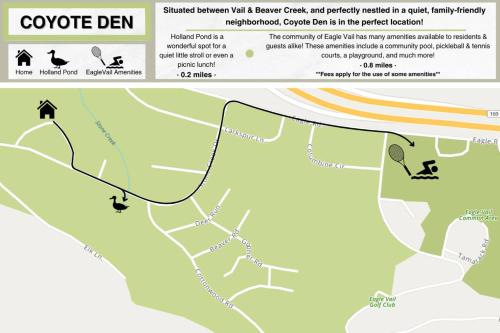 يقع مكان إقامة "Coyote Den" في آفون على بُعد 1.9 كم من Eagle Vail Golf Club، و17 كم من Vail Nordic Center في منطقة حيث يمكن للضيوف الاستمتاع بالتزلج. يقع بيت العطلات هذا على بُعد 17 كم من Vail Golf Club و25 كم من Red Sky Golf Club Norman Course.