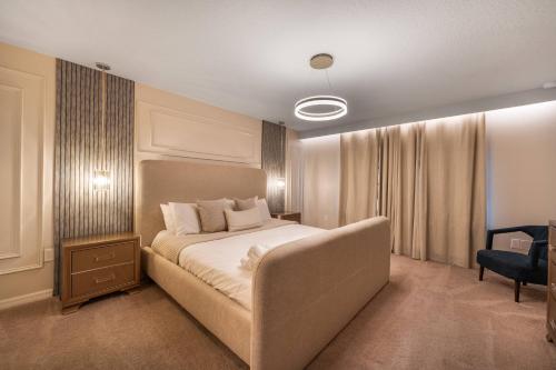 تتوفر (5) غرفة نوم في بيت العطلات، ومطبخ فيه ثلاجة وغسالة صحون، و (4) حمّام مع دش ومجفف للشعر وغسالة ملابس. تتوفر مناشف وبياضات أسرّة في بيت العطلات.