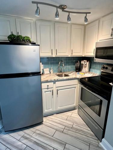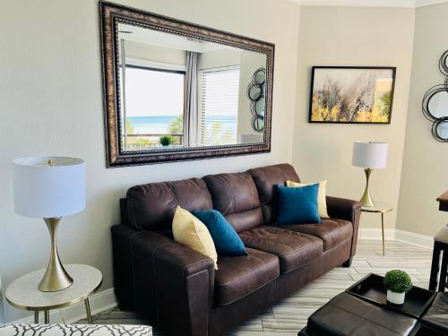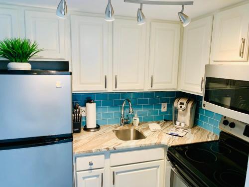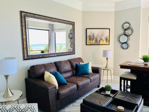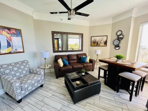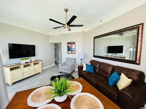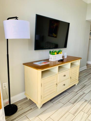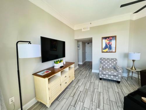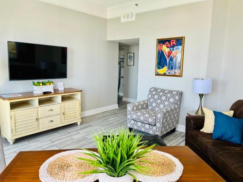 تتوفر (1) غرفة نوم في الشقة، وغرفة معيشة، وتلفزيون بشاشة مسطحة، ومطبخ مجهز فيه ثلاجة وفرن، و (1) حمّام مع حوض استحمام ساخن، بالإضافة إلى شرفة وإطلالات على البحر. تتوفر مواقف خاصة للسيارات مجاناً في مكان إقامة "210 Sea Gem Oceanfront Pet Friendly Indoor Pools".