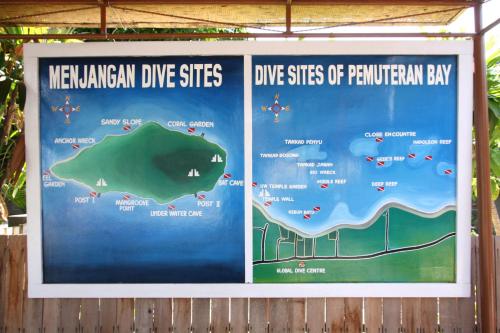 يبعد نزل Global Dive مسافة 30 دقيقة بالسيارة من حديقة غرب بالي الوطنية، ويمكن الوصول إلى جزيرة Menjangan الجميلة من الميناء الواقع على بعد 5 دقائق بالسيارة من مكان الإقامة، حيث يمكن ركوب القارب التقليدي إلى هناك في غضون 30 دقيقة. بينما يبعد مطار Ngurah Rai الدولي 3 ساعات ونصف بالسيارة.
