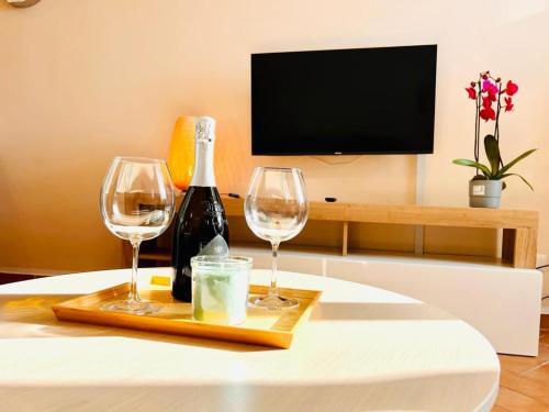 تتوفر (1) غرفة نوم في الشقة، وغرفة معيشة، ومطبخ مجهز بالكامل فيه ثلاجة وماكينة قهوة، و (1) حمّام مع بيديت ودش، وجهاز تكييف. تتوفر مناشف وبياضات أسرّة في الشقة.
