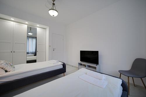 تتوفر (2) غرفة نوم في هذه الشقة، وغرفة معيشة، ومطبخ مجهز بالكامل فيه ثلاجة وماكينة قهوة، و (1) حمّام مع دش ولوازم استحمام مجاناً، وجهاز تكييف. تتوفر مناشف وبياضات أسرّة في الشقة.