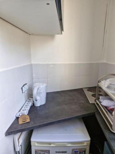 تتوفر (1) غرفة نوم في الشقة، ومطبخ صغير فيه ثلاجة وميكروويف، و (1) حمّام مع حوض استحمام ولوازم استحمام مجاناً.