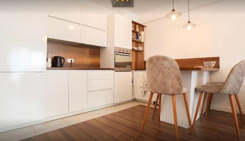 تتوفر (2) غرفة نوم في الشقة، وغرفة معيشة، وتلفزيون بشاشة مسطحة، ومطبخ مجهز فيه ثلاجة وغسالة صحون، و (1) حمّام مع دش، بالإضافة إلى شرفة وإطلالات على المدينة.