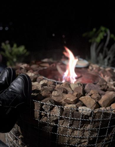 Guests can relax near the outdoor fireplace at the campground.