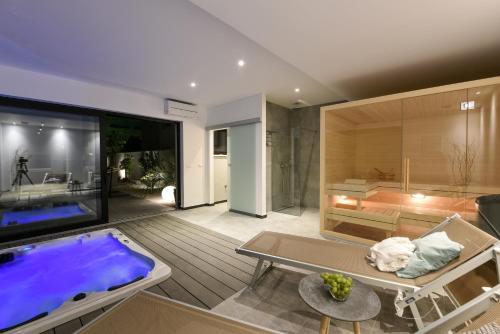 Set in Zadar, Villa Omnia offers a patio with sea and mountain views, as well as a seasonal outdoor pool, sauna and hot tub. This beachfront property offers access to a terrace, table tennis, free private parking and free WiFi. The accommodation offers free shuttle service and a 24-hour front desk for guests.