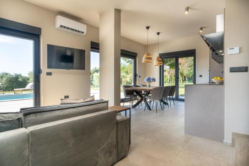 The spacious villa is fitted with 3 bedrooms, 3 bathrooms, bed linen, towels, a flat-screen TV with streaming services, a dining area, a fully equipped kitchen, and a terrace with sea views. Guests can take in the views of the mountain from the balcony, which also has outdoor furniture. There is also a seating area and a fireplace.