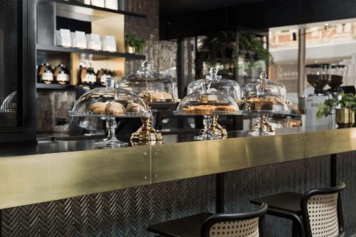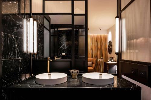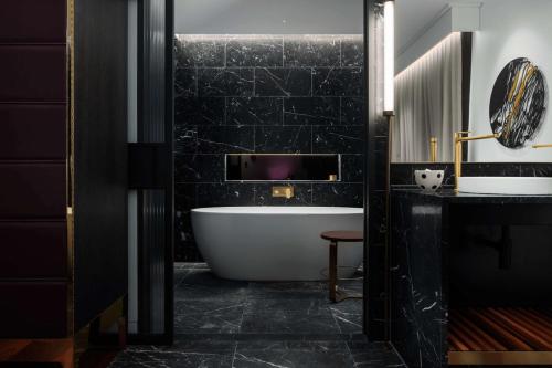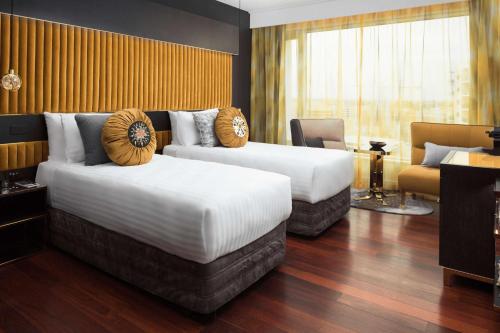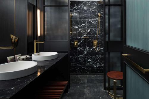 Each lavish room is designed with local jarrah timber, rich velvet and polished brass. There are dark stone bathrooms, signature QT Dream Beds, a minibar and a coffee machine. Most rooms have city views.