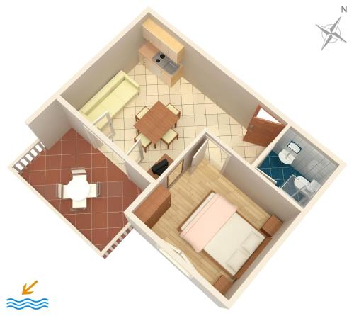 Tento apartmán s klimatizací má 1 ložnici, obývací prostor, kuchyň s kompletním vybavením včetně lednice a varné desky a 1 koupelnu. Koupelna je vybavená sprchou.