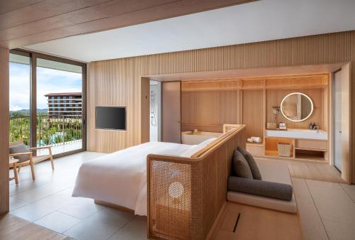 The Taikang Sanya, a Tribute Portfolio Resort se nachází v destinaci San-ja a poskytuje ubytování s venkovním bazénem, neplaceným soukromým parkovištěm, fitness centrem a zahradou. Pláž Haitang Bay je několik kroků daleko. Toto ubytování nabízí dětský klub, restauraci, akvapark a terasu. Toto ubytování nabízí pokojovou službu, nepřetržitě otevřenou recepci a směnárenské služby.
