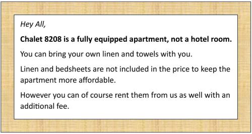 Tento apartmán má 2 ložnice, 1 koupelnu, kuchyň s kompletním vybavením včetně jídelní části a lednice a obývací prostor s TV s plochou obrazovkou. Koupelna je vybavená bidetem, sprchou a fénem.