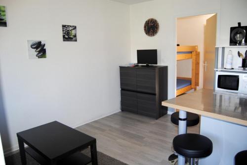 Tento apartmán má 1 ložnici, obývací prostor s TV, kuchyň s kompletním vybavením včetně lednice a koupelnu.