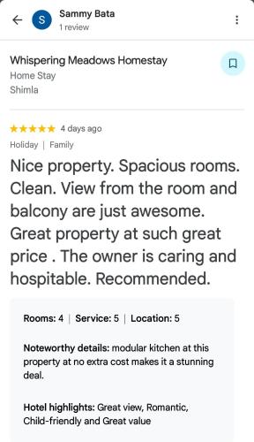 Whispering Meadows U get entire 3 BHK se nachází v destinaci Šimla v oblasti Himachal Pradesh a má balkon a výhled na hory. Ubytování nabízí terasu a neplacené soukromé parkoviště. Victory Tunnel se nachází 8,1 km odtud.