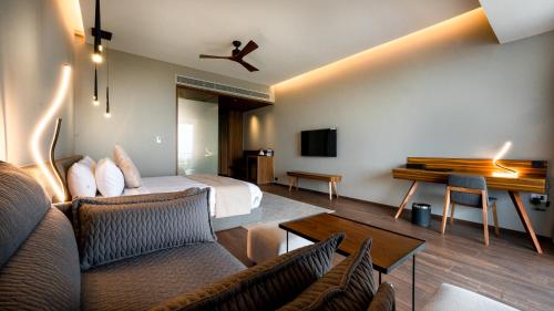 Všechny pokoje jsou vybaveny klimatizací, TV s plochou obrazovkou se satelitními programy, minibarem, varnou konvicí, sprchou, bezplatnými toaletními potřebami a psacím stolem. Všechny pokoje zahrnují trezor. Některé pokoje mají terasu a jiné mají také výhled na hory. Všechny pokoje v ubytování Aria Resort & Spa mají v ceně ložní prádlo a ručníky.
