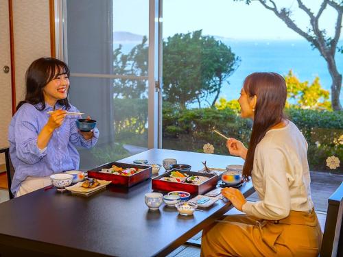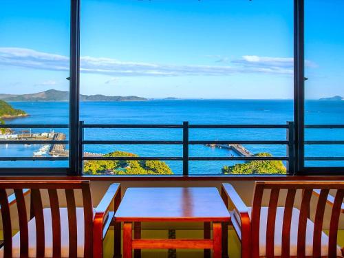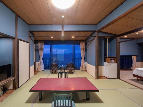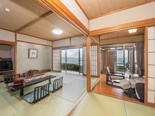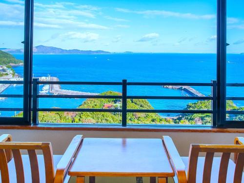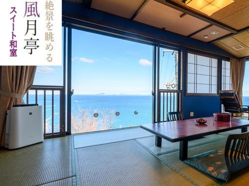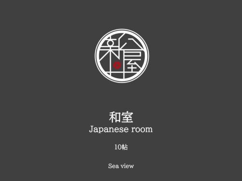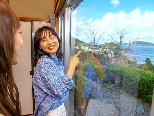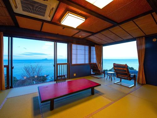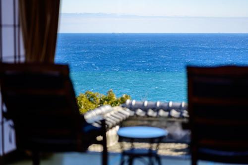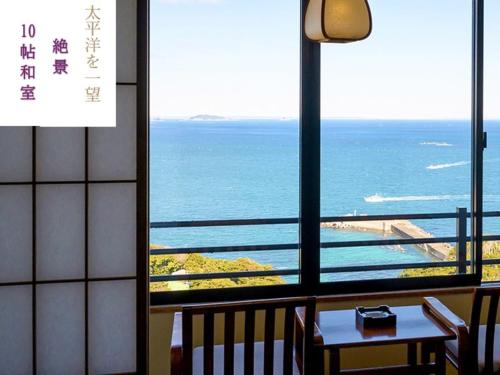 Pokoje v ubytování 絶景海風癒し庵 新八屋 mají vlastní koupelnu a otevírá se z nich výhled na moře.