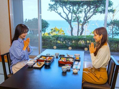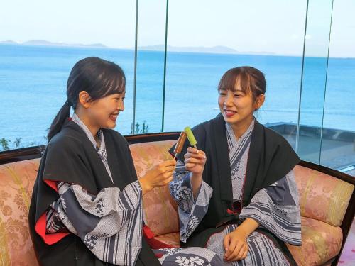 Pokoje v ubytování 絶景海風癒し庵 新八屋 mají vlastní koupelnu a otevírá se z nich výhled na moře.
