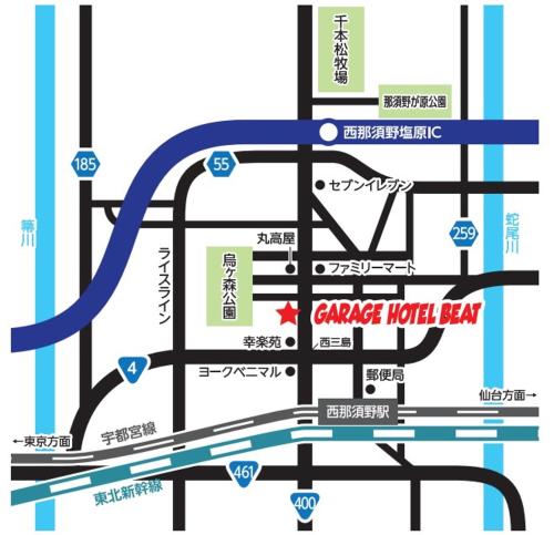 Set in Nasushiobara, within 41 km of Shirakawa Station and 41 km of Komine Castle, ガレージホテルBeat offers accommodation with a shared lounge and free WiFi as well as free private parking for guests who drive. The property is situated 46 km from Nikko Station, 49 km from Nikko Toshogu Shrine and 49 km from Rinno-ji Temple. The property is non-smoking and is located 45 km from Tobu Nikko Station.