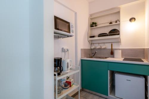 Tento apartmán s klimatizací má 1 ložnici, obývací prostor, kuchyňský kout s kompletním vybavením včetně lednice a mikrovlnné trouby a 1 koupelnu. Koupelna je vybavená bidetem a fénem. K dispozici jsou i ručníky a ložní prádlo.