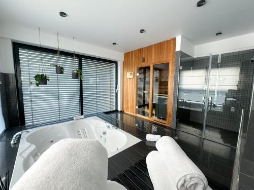 Apartmán má 2 ložnice, 2 koupelny, TV s plochou obrazovkou se satelitními programy, jídelní část a kuchyň s kompletním vybavením. Může se pochlubit také terasou s výhledem na město. Koupelna je vybavená sprchou, vířivkou a fénem.