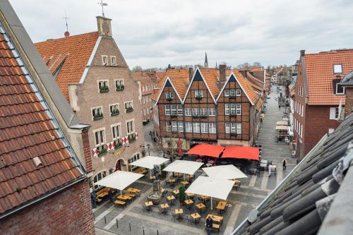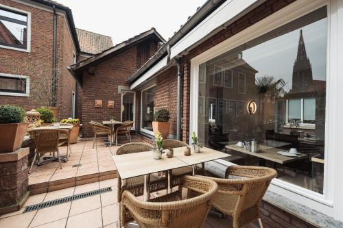 Za pěkného počasí si můžete vychutnat jídlo na malé střešní terase s výhledem na kostel Lambertikirche.
