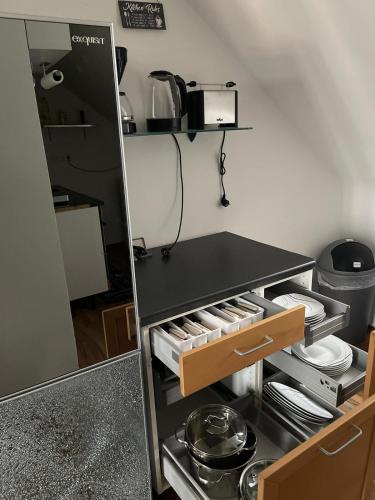 K vybavení kuchyně patří lednice, mikrovlnná trouba, kávovar a varná konvice.