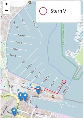 STERN V - Stern Hausboot se nachází v destinaci Heiligenhafen a nabízí bezplatné Wi-Fi a výhled na moře. Pláž Strand am Steinwarder se nachází jen 2,8 km daleko a Fehmarnsund 11 km. Ubytování poskytuje terasu a neplacené soukromé parkoviště. Pláž Heiligenhafen se nachází 1,2 km odtud.