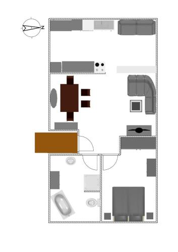 Tento apartmán má 1 ložnici, obývací prostor s TV, kuchyň s kompletním vybavením včetně lednice a myčky nádobí a koupelnu s fénem.