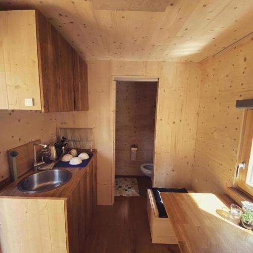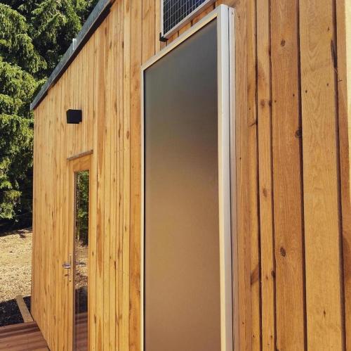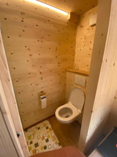 Chata má také kuchyňský kout s lednicí, jídelní část a koupelnu.