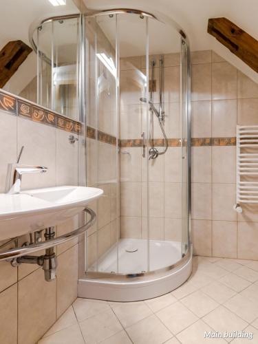 The rooms at Hotel Spichrz are elegant, feature beams and wooden furnishings and most of them offer a view of the Wisła River. Each comes with a refrigerator and a bathroom equipped with a bath or a shower and a hairdryer.