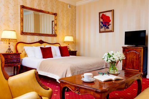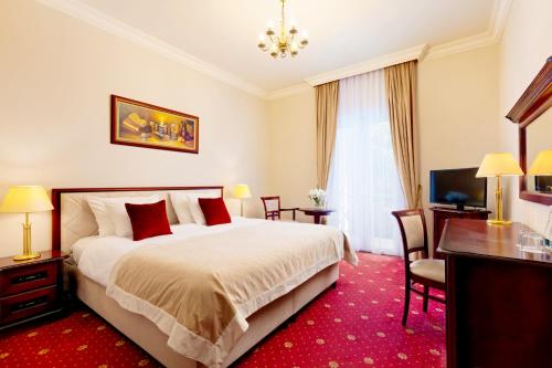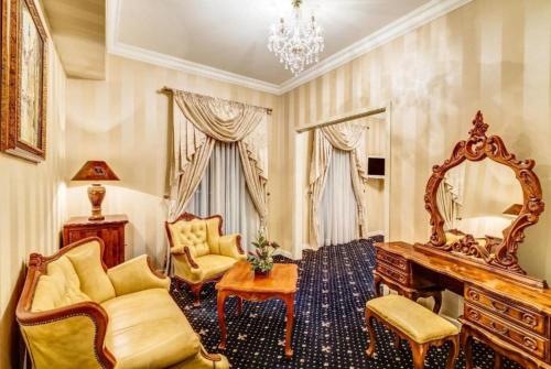 Pokoje se mohou pochlubit elegantním palácovým interiérem. Všechny jsou vybavené satelitní TV s plochou obrazovkou. Ve vlastní koupelně najdete fén a ručníky. Nechybí ani ložní prádlo.