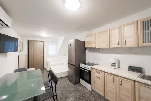 Tento apartmán s klimatizací má 2 ložnice, obývací prostor, kuchyňský kout s kompletním vybavením včetně lednice a mikrovlnné trouby a 2 koupelny. Koupelna je vybavená vanou nebo sprchou a fénem. K dispozici jsou i ručníky a ložní prádlo.