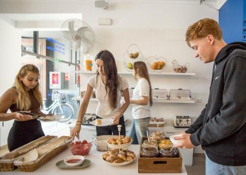 Najdete tu prodejní automaty s občerstvením a v kavárně hostelu si můžete dát snídani. Využívat zde můžete hernu, lounge a zdarma také sdílenou kuchyň.