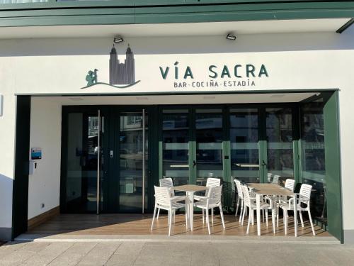 Vía Sacra se nachází v destinaci Porta a nabízí zahradu, terasu, bar a bezplatné Wi-Fi. Kongresové a výstavní centrum se nachází 45 km daleko a Lugo Cathedral 45 km. Ubytování se nachází v budově z roku 2019. Roman Walls of Lugo je 45 km daleko. Na přepážce s turistickými informacemi vám mohou poskytnout informace o zdejší oblasti.