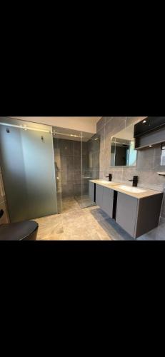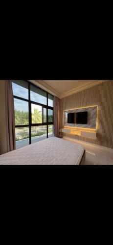 Tato vila s klimatizací má 2 ložnice, TV s plochou obrazovkou, jídelní část a kuchyň s lednicí a myčkou nádobí.