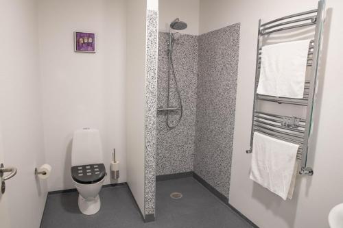 Der er et fuldt udstyret privat badeværelse med bruser og en hårtørrer.