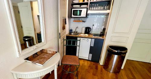Lejligheden har 1 soveværelse med aircondition og et fuldt udstyret køkken med køleskab.