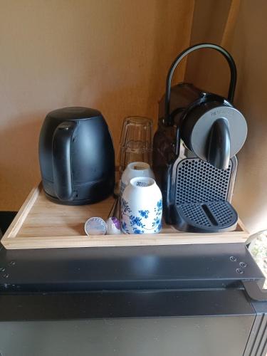 Der er også et køleskab samt kaffemaskine og kedel.