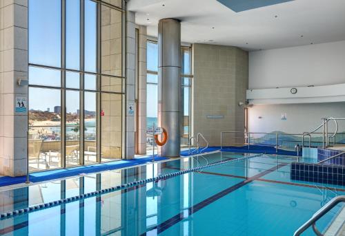 Gæsterne kan benytte indendørs pool og have hos lejligheden.