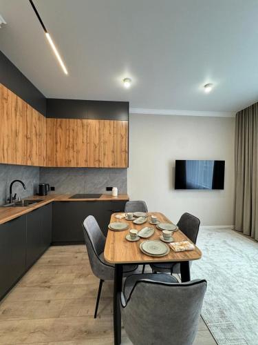 2- комнатные Апартаменты Люкс в ЖК R-House ligger i Almaty, 2,5 km fra First President of Kazakhstan Park, 3,8 km fra Atakent-Expo og 4,8 km fra Dolphin Entertainment Centre. Denne lejlighed har udsigt til by og bjerg. Her er også gratis wi-fi.