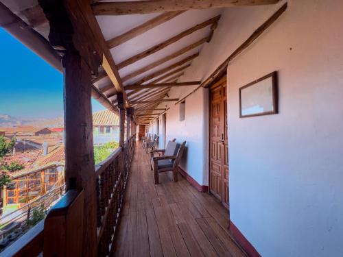 At El Balcon, guests relax on the rustic wood gallery balconies while sipping on a Coca tea and admiring panoramic views of picturesque Cusco and the Andean scenery.