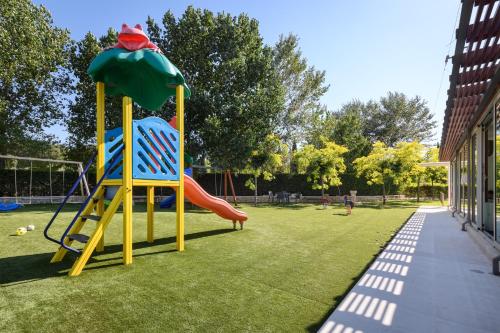 The Hotel has a restaurant, bar, library, games room, outdoor swimming pool with bar (seasonal), gym, padel court, kids club, playground, small farm with animals, pine forest for outdoor activities, and organic vegetable garden .