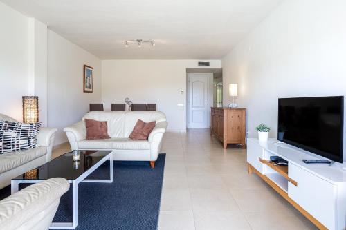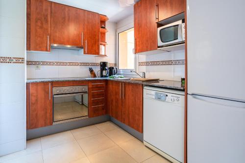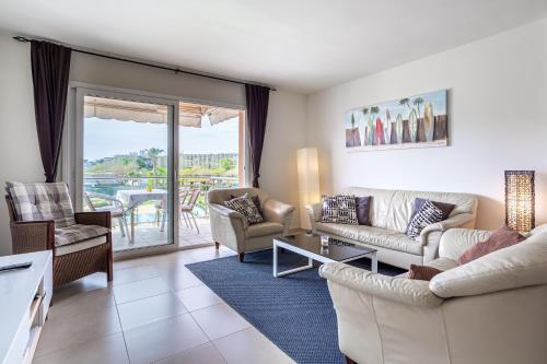 Lejligheden har 3 soveværelser, 2 badeværelser, sengetøj, håndklæder, tv, et fuldt udstyret køkken og terrasse med udsigt til en have.