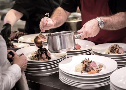 Der tilbydes morgenmad med buffet, kontinentale retter eller vegetariske retter på overnatningsstedet. Bjertorp Slott har en restaurant der serverer lokale retter, internationale retter og europæiske retter. Der kan også anmodes om vegetariske retter, laktosefri retter og kosher retter.